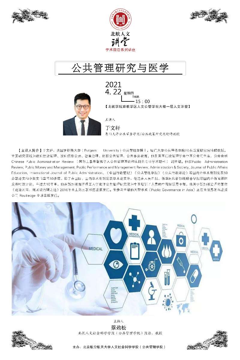 4月22日,北航“人文講堂”學(xué)術(shù)前沿系列講座在人文社會(huì)科學(xué)學(xué)院(公共管理學(xué)院)人文講堂舉行。本次講座邀請(qǐng)了美國(guó)羅格斯大學(xué)(Rutgers University)公共管理學(xué)博士,廈門(mén)大學(xué)公共事務(wù)學(xué)院/公共政策研究院特聘教授于文軒作題為“公共管理研究與醫(yī)學(xué)”的學(xué)術(shù)前沿講座。講座由人文社會(huì)科學(xué)學(xué)院(公共管理學(xué)院)院長(zhǎng)蔡勁松教授主持。