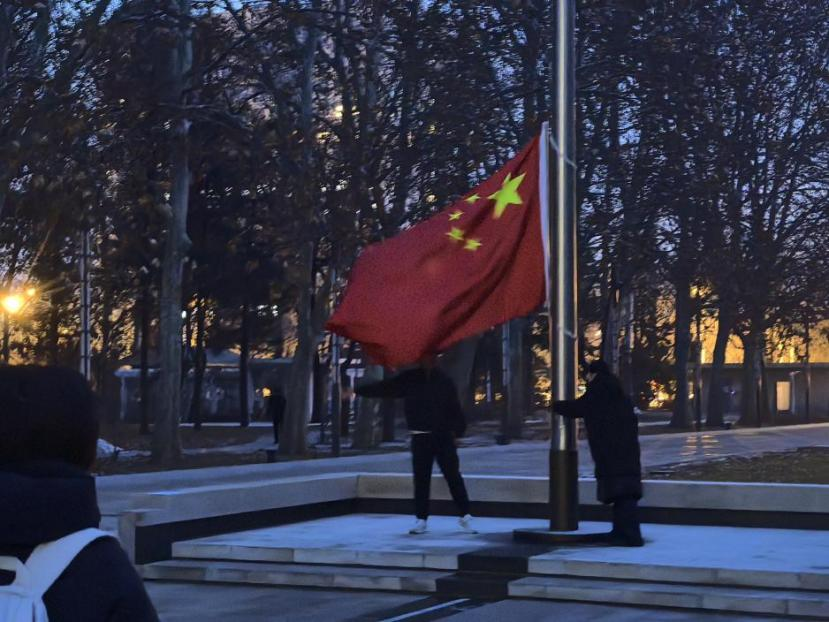 12月25日早晨,231131與231132小班全體同學(xué)在主樓廣場(chǎng)莊嚴(yán)舉行升旗儀式。凜冽寒風(fēng)中,同學(xué)們神情肅穆、齊唱國(guó)歌,注視五星紅旗伴隨雄壯旋律冉冉升起,以青春熱血表達(dá)對(duì)祖國(guó)的赤誠(chéng)熱愛。