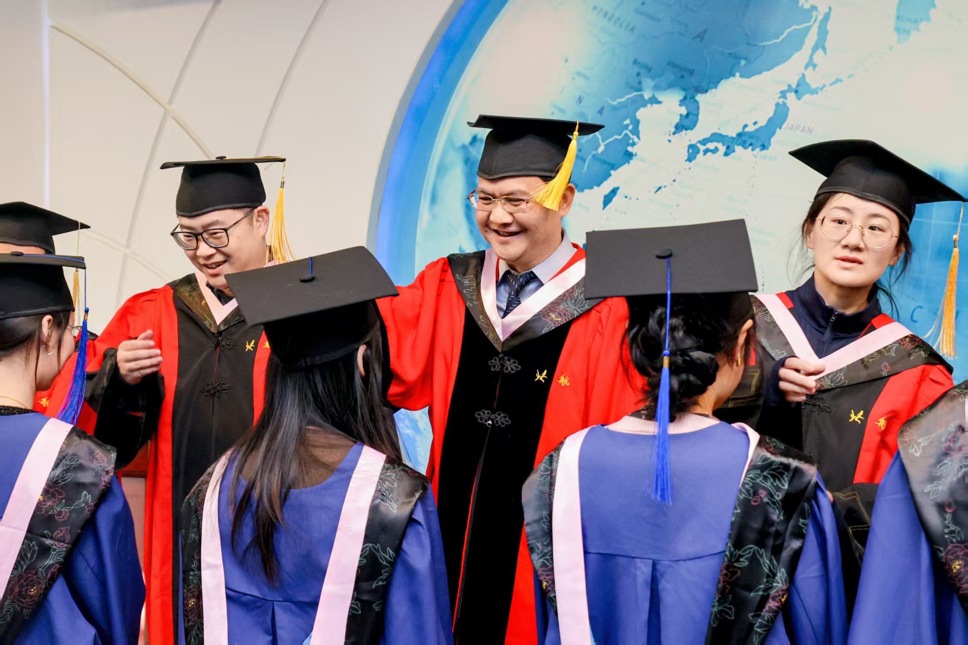 典禮結(jié)束后,學(xué)院舉行了學(xué)位授予儀式。導(dǎo)師代表們?yōu)槊恳晃划厴I(yè)生撥穗正冠。