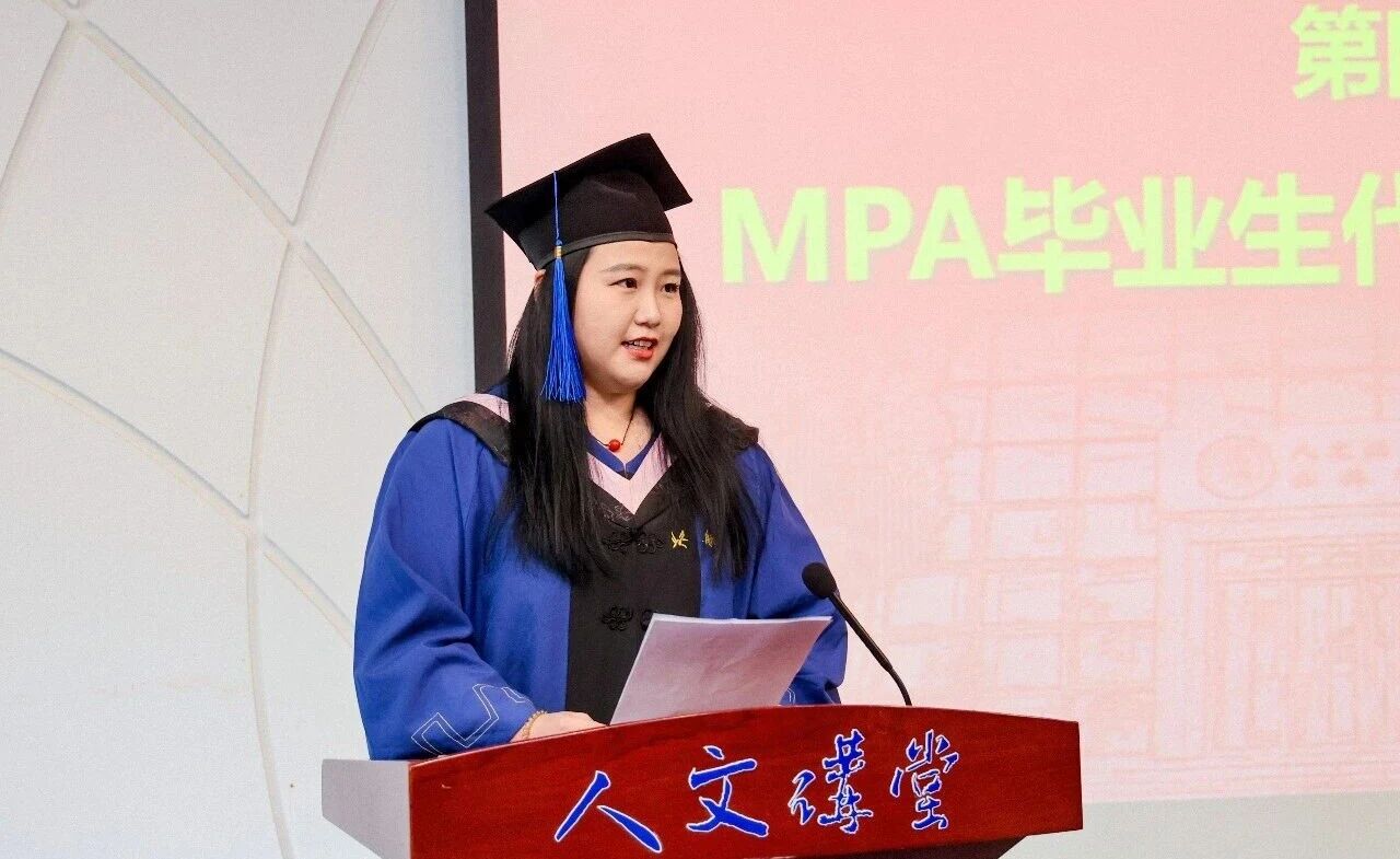 MPA畢業(yè)生代表張琪琛同學(xué)在發(fā)言中回憶了在職求學(xué)期間,在工作、家庭與學(xué)業(yè)之間奔波平衡的難忘經(jīng)歷,表達(dá)了對學(xué)校栽培、恩師教誨與家人支持的感恩之情。她談到,這段求學(xué)時(shí)光不僅是知識(shí)體系的重塑,更是精神境界的升華,北航精神早已融入血脈,未來將帶著這份使命情懷,深耕公共服務(wù)領(lǐng)域,用專業(yè)能力回饋社會(huì)。