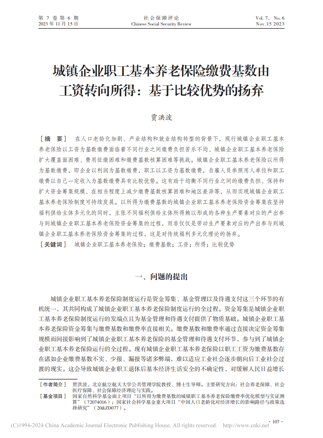 近日,北京航空航天大學(xué)人文社會科學(xué)學(xué)院(公共管理學(xué)院)教授賈洪波在《社會保障評論》發(fā)表《城鎮(zhèn)企業(yè)職工基本養(yǎng)老保險繳費(fèi)基數(shù)由工資轉(zhuǎn)向所得:基于比較優(yōu)勢的揚(yáng)棄》論文,以下為文章全文。