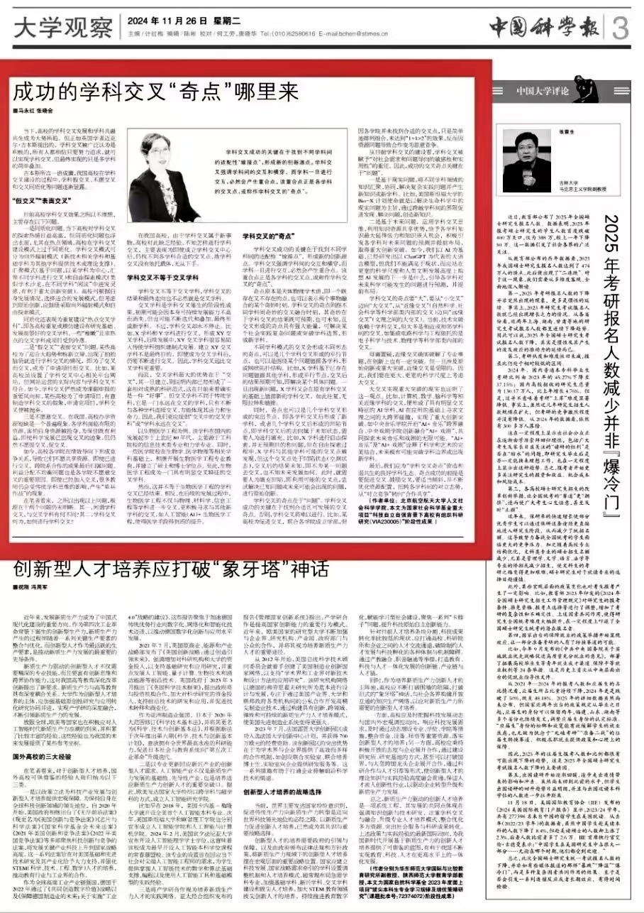 近日,北京航空航天大學人文社會科學學院(公共管理學院)馬永紅教授、博士研究生張曉會在《中國科學報》發(fā)表《成功的學科交叉“奇點”哪里來》一文。該文章指出學科交叉成功的關鍵在于找到不同學科間的適配性“嫁接點”,形成新的創(chuàng)新源點。學科交叉強調學科間的交互和橫穿,而學科一旦進行交互,必然會產(chǎn)生重合點,該重合點正是各學科的交叉點,或稱作學科交叉的“奇點”,而成功的學科交叉“奇點”關鍵在于“問題”。