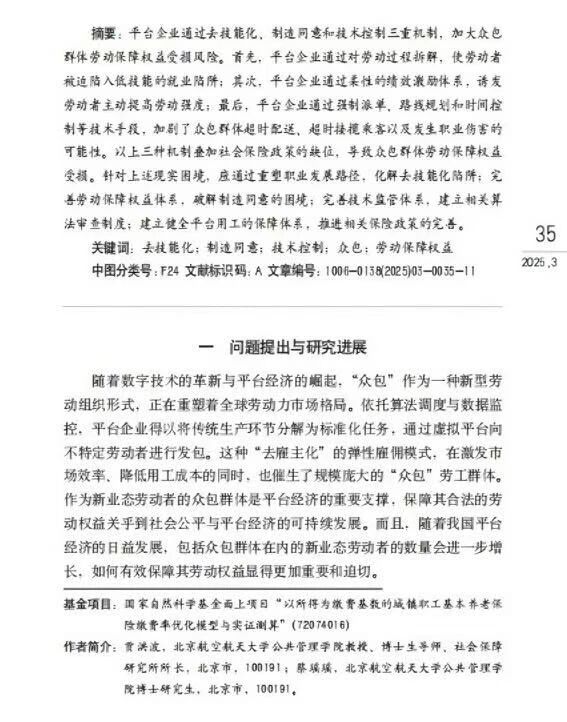 近日,北京航空航天大學(xué)人文社會(huì)科學(xué)學(xué)院(公共管理學(xué)院)賈洪波教授、博士研究生蔡瑤瑤發(fā)表《去技能化、制造同意和技術(shù)控制:眾包群體勞動(dòng)保障權(quán)益受損探析》一文,被《人大復(fù)印報(bào)刊資料·勞動(dòng)經(jīng)濟(jì)與勞動(dòng)關(guān)系》2025年第9期全文轉(zhuǎn)載。