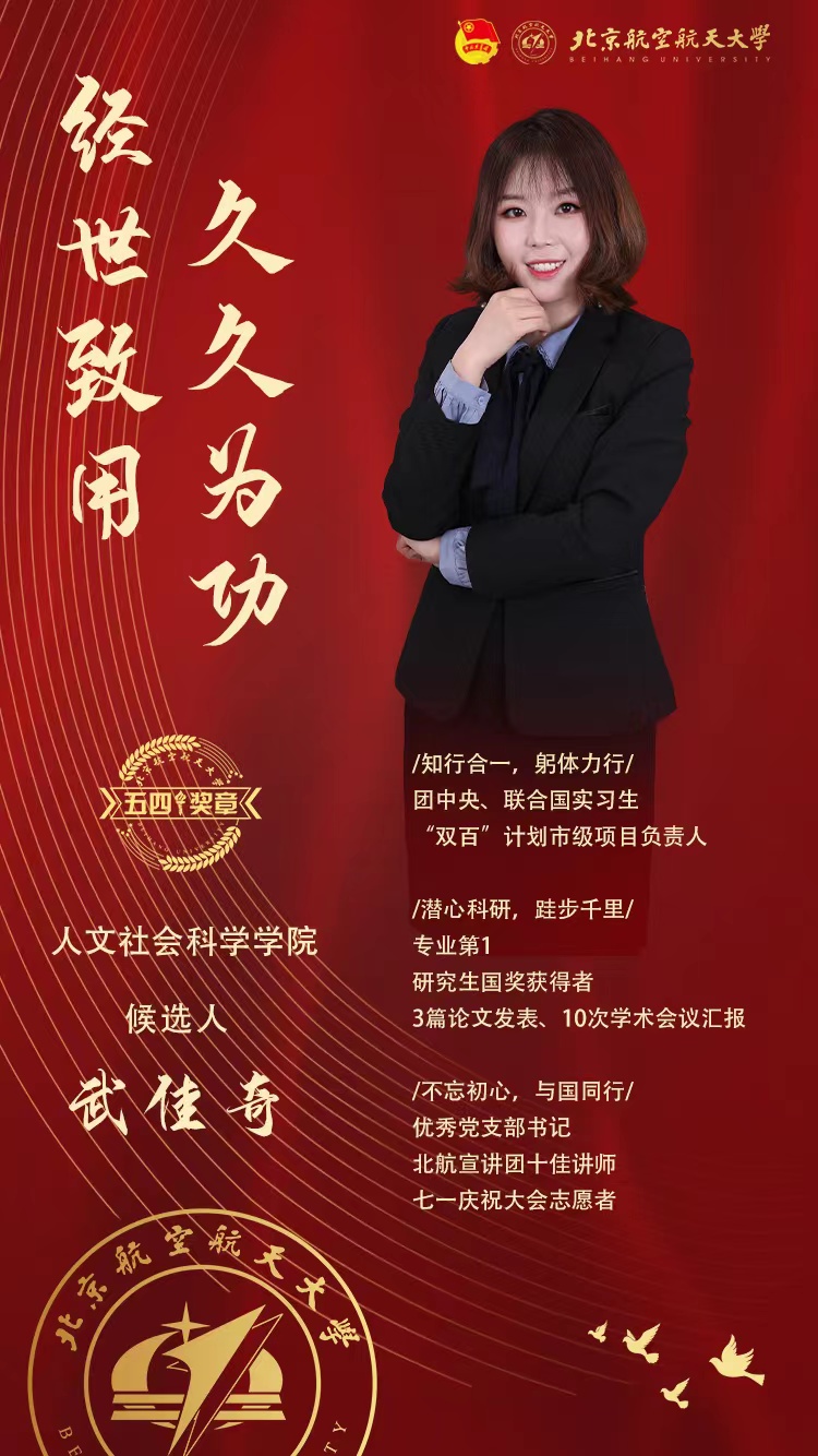 4月27日,北京航空航天大學(xué)第十七屆“五四獎(jiǎng)?wù)隆贝疝q會(huì)在如心大報(bào)告廳舉行,人文社會(huì)科學(xué)學(xué)院2020級碩士研究生武佳奇榮獲2022年北航“五四獎(jiǎng)?wù)隆?/span>。